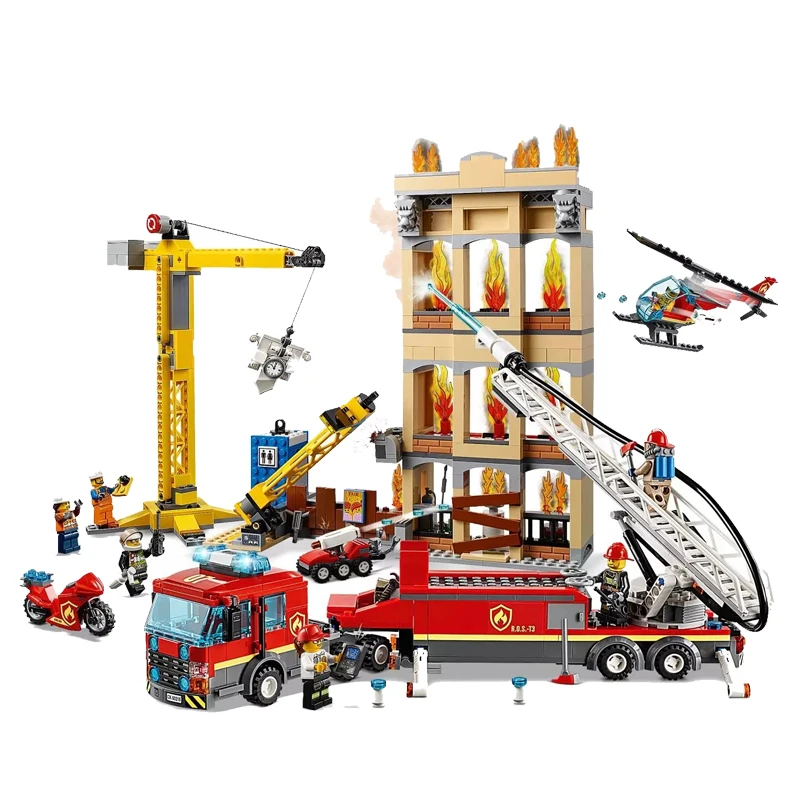 HIGH QUALITY 985pcs Toys Downtown Fire Brigade Ladder Truck Crane Helicopter Compatible Legoinglys City 60216 Bu